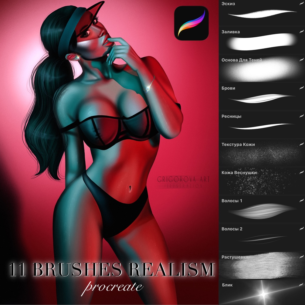 Набор из 11 кистей ✍🏼для программы Procreate для создания иллюстраций в стиле полуреализм. Шикарный набор для создания невероятно красивой и бархатной кожи, реалистичных волос и бровей😍
